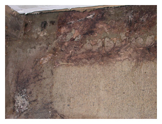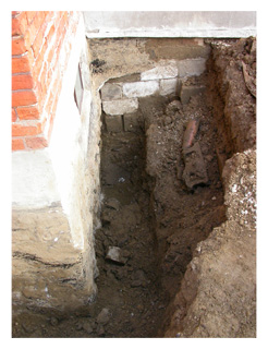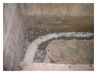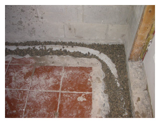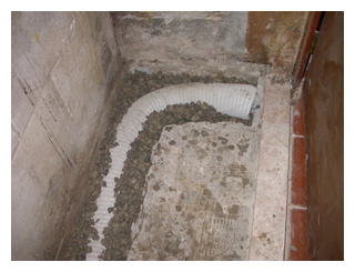 Work was performed from the inside of the basement. The floor is opened next to the outside walls, and drain tile is installed and surrounded by gravel. The pipe is connected to a sump pump, which discharges the water. |