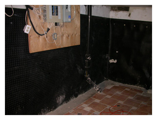 Leaking basement before we installed drainage membrane which directs the flow of water to a network of drainage tiles.